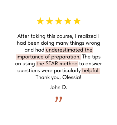 I was surprised by the insights this course provided. As a newbie in the job market, I found it incredibly valuable. I realized that my previous preparation was not what was needed, and I had made many mistakes. Perhaps for the better, as now I'm growing my career in the company of my dreams. Thank you, Olessia!